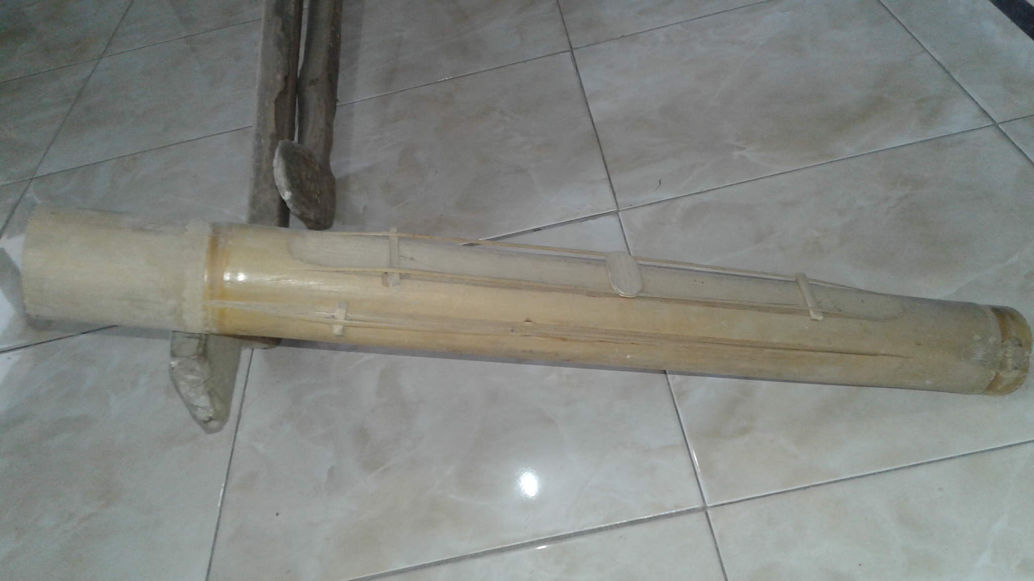 Berbahan dasar bambu 1,5 ruas, dicungkil pada posisi di tiga sisi dibuat semacam tali/senar di tiga titik. Salah satu sisi diberi lobang ditengah agar memberikan efek gaung suara dari tali senar tersebut. Ruas di posisi atas diberi lobang agar menjadikan efek suara kendang.