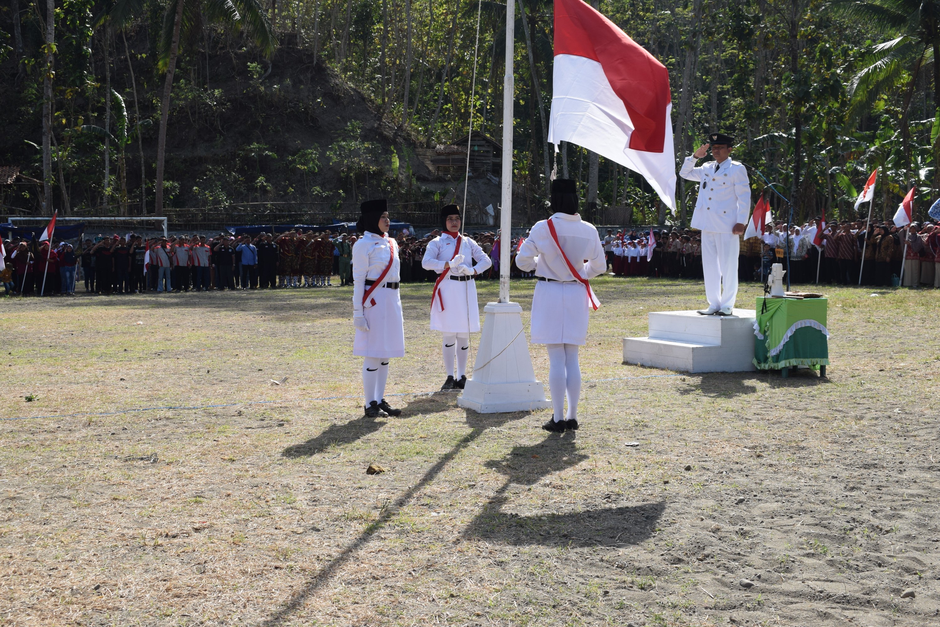 Petugas Paskibra yang semuanya terdiri dari kaum perempuan dapat menjalankan proses pengibaran bendera dengan baik. Diiringi lagu Indonesia Raya yang dinyanyikan oleh regu koor SD Negeri 1 Dermaji, proses pengibaran bendera menjadi begitu sakral dan mengharukan.